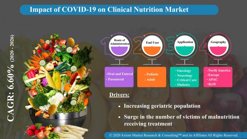 Wilmington, June 30, 2020: Axiom Market Research & Consulting™ published a report on global clinical nutrition market which includes study on route of administration, end user, application across various countries of key regions across the globe. The global clinical nutrition market was anticipated to grow at a CAGR of 6.45% for the forecast period 2020 to 2026. The study also covers economic indicators analysis by major countries and COVID-19 impact on clinical nutrition market of respective countries along with GDP, healthcare expenditure, government policies, business investments, key marketing strategies etc. The global market is estimated and forecasted in terms of revenue (USD Million) generated by the clinical nutrition market.The global clinical nutrition market is analysed on route of administration, end user, application and geography. By route of administration, the market is segmented into oral & enteral and parenteral. paediatric and adults are the major end users of this market. The global clinical nutrition market finds application in malnutrition, metabolic disorders, gastrointestinal diseases, neurological diseases, diabetes, and other diseases. The global clinical nutrition market is studied across major countries of North America, Europe, Asia Pacific and Rest of the World.