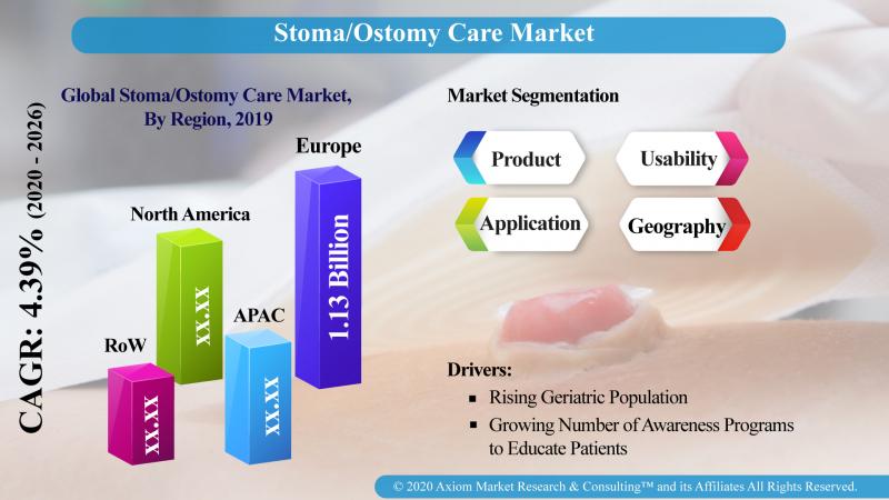 Wilmington, 30 June, 2020: Axiom Market Research & Consulting (TM) added a report on global stoma/ostomy care market which includes study on product, usability, application, end user and across various countries of key regions across the globe. The global ostomy care market was anticipated to grow at a CAGR of 4.39 % for the forecast period 2020 to 2026. The global market is estimated and forecasted in terms of revenue (USD Million) generated by the ostomy care market.An ostomy is a surgical formation of an abdominal opening that allows a connection from an internal organ (such as the intestine) to the skin surface with the purpose of the elimination of bodily waste products, such as feces, urine and mucus. The ostomy drainage bags are attached to the artificial orifice to collect the bodily waste. The ostomy care systems are incorporated in treating numerous gastrointestinal disorders. Ostomy care includes products such as bags and accessories. Ostomy bag is attached to the skin of the patient by skin adhesives and is used as a receptacle for collection of urine or fecal material following a ureterostomy, colostomy, or ileostomy. There are different types of ostomy care accessories such as creams, pastes, deodorants, seals/barrier rings, etc.