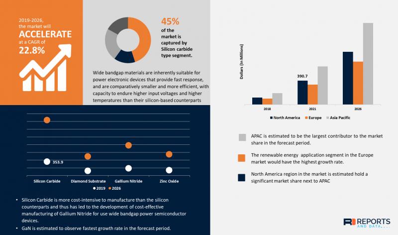 The global wide-bandgap power semiconductor devices market is expected to reach USD 3250 million by 2026, according to a new report by Reports and Data. Wide bandgap semiconductors are those which have a wide bandgap between the valence band and the conduction band. With wide bandgap semiconductor devices play a significant role in achieving high efficiency in high power density devices. These semiconductors have approximately ten fold better conduction capability and switching property than silicon-based semiconductors. Wide bandgap materials are inherently suitable for power electronic devices that provide fast response, and are comparatively smaller and more efficient, with capacity to endure higher input voltages and higher temperatures than their silicon-based counterparts.Get FREE Sample Copy with TOC of the Report to understand the structure of the complete report@ https://www.reportsanddata.com/sample-enquiry-form/1396
