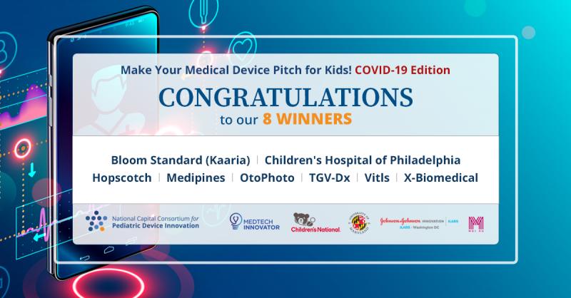 WASHINGTON – (July 22, 2020) – The National Capital Consortium for Pediatric Device Innovation (NCC-PDI) announces eight winners chosen in its special COVID-19 edition of the “Make Your Medical Device Pitch for Kids!” competition. Focused on innovations in COVID-19-related pediatric medical devices that will improve children’s health care, 16 finalists competed on Monday, July 20 in a virtual pitch event for a share of $250,000 in total grant awards.A panel of 75 expert judges from health care, business, investor and regulatory sectors selected award winners based on the clinical significance and commercial feasibility of their COVID-19-related medical devices for children. The competition focused on medical devices that support home health monitoring and telehealth, and improve sustainability, resiliency and readiness in diagnosing and treating children during a pandemic.