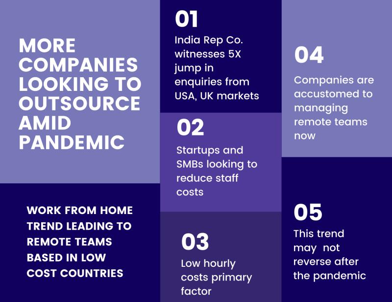 As the global COVID-19 pandemic drove hundreds of thousands of people around the world to home offices as "work from home" (WFM) employees, more companies started looking to deploy offshore teams in lower cost countries to save costs.India Rep Co., a back office support services company that provides support to companies looking to outsource work, has reported a surge of interest from global corporations looking to cut costs in the midst of the economic recession created by the pandemic.