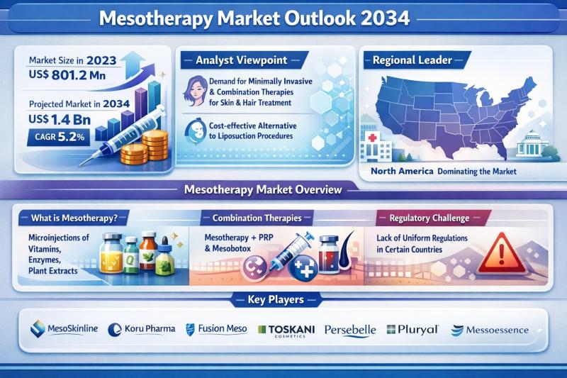 The global mesotherapy industry was valued at US$ 801.2 Mn in 2023 and is poised for steady expansion over the next decade. Driven by rising demand for minimally invasive aesthetic procedures and the growing popularity of combination therapies for skin rejuvenation and hair loss, the market is expected to grow at a compound annual growth rate (CAGR) of 5.2% from 2024 to 2034, reaching US$ 1.4 Bn by the end…
