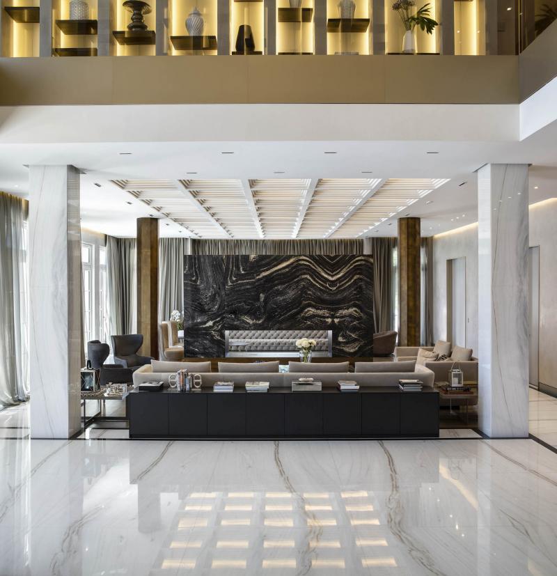 The sense of grandeur is expressed not only by the size of the property, but also by the open interior layout. To begin with, the entire living area, which was demarcated by six slim steel columns, needed to be visualized as a modern/contemporary loft-like environment. Giusi Mastro suggested creating four sections – Dining Area, Salon, Formal Living Area and Media Area - by realizing a core in the open space, characterized by a double height ceiling, and delineated by four columns. First, the columns were changed in size and material to be in scale with the grandeur of the space. Adjacent to that, Giusi Mastro conceived a freestanding monumental marble fireplace, flanked by two columns that were enveloped in octagonal shaped bronze finish. The fireplace constitutes a backdrop for the Formal Living Area, and on the other side, a demarcation of the Media Area.