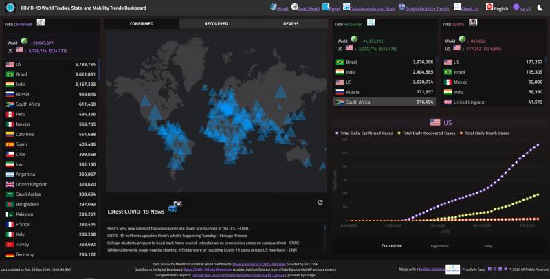 The tracking feature includes three main dashboards; the first one is for the entire World, the second one is dedicated for the Arab World, and the third one is dedicated for Egypt along with its governorates.