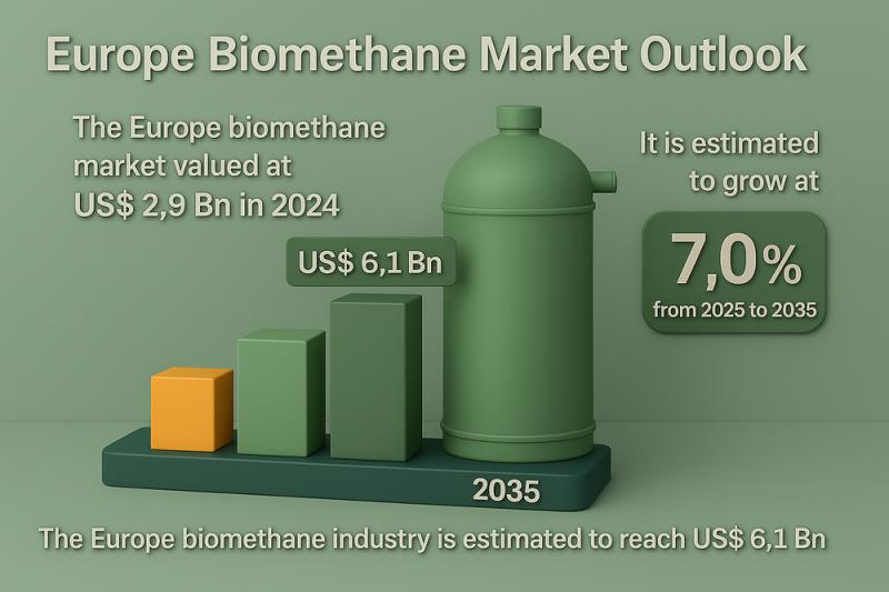 The Europe biomethane market, valued at US$ 2.9 billion in 2024, is projected to grow at a compound annual growth rate (CAGR) of 7.0% from 2025 to 2035, reaching an estimated US$ 6.1 billion by the end of 2035, according to the latest market analysis report. The growth is underpinned by favorable European Union (EU) energy directives, strong government incentives, and growing demand for renewable energy to achieve the region's…