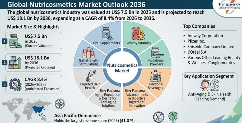 The global nutricosmetics market was valued at US$ 7.5 Bn in 2025 and is projected to reach US$ 18.1 Bn by 2036, expanding at a robust CAGR of 8.4% from 2026 to 2036. Nutricosmetics-nutritional supplements and functional products designed to enhance skin, hair, and nail health from within-are gaining substantial traction worldwide. The growing consumer shift toward holistic wellness, preventive healthcare, and clean-label beauty solutions is significantly driving market expansion.