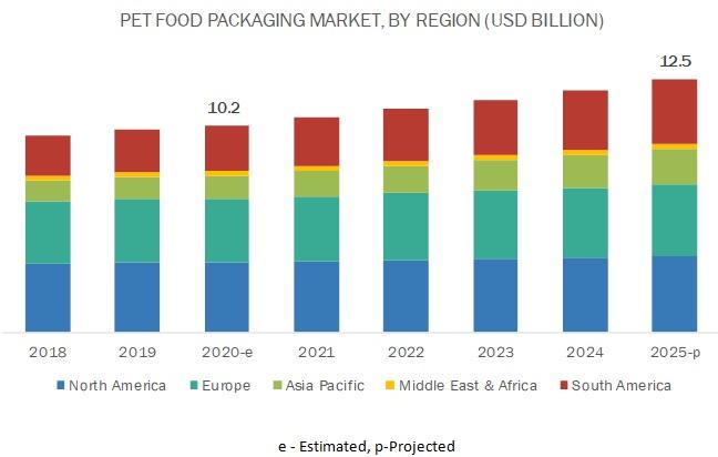 The report "Pet Food Packaging Market by Material Type (Paper & Paperboard, Plastic, Metal), Packaging Form (Bags, Cans, Pouches, Boxes/Cartons), Food Type (Dry Food, Wet Food, Pet Treats), Animal Type (Dog, Cat, Fish, Bird), Region - Global Forecast to 2025" The global pet food packaging market size is projected to grow from USD 10.2 billion in 2020 to USD 12.5 billion by 2025, at a CAGR of 4.2% from 2020 to 2025. The market is expected to grow in tandem with the growth of the pet food industry across the globe. An increase in the number of pet adoptions is resulting in higher consumption of pet food. Innovations in packaging, simple and convenient packaging designs, innovation in packaging will boost the demand for pet food packaging.Download PDF Brochure @ https://www.marketsandmarkets.com/pdfdownloadNew.asp?id=150550375
