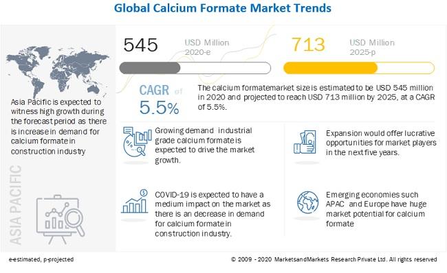 The report "Calcium Formate Market by Grade, Application ( Feed Additives, Tile & Stone Additives, Concrete Setting, Leather Tanning, Drilling Fluids, Textile Additives, Flue gas desulfurization), End-use Industry, and Region - Global Forecast to 2025", size is expected to grow from USD 545 million in 2020 to USD 713 million by 2025, at a CAGR of 5.5% during the forecast period. Calcium formate are used across industries, such as construction, leather & textile, power generation, animal husbandry and chemicals. In the calcium formate market, construction is the key end-use industry owing to the wide applications of calcium formate as concrete setting, tile & stone additive, and others in this sector.Download PDF Brochure @ https://www.marketsandmarkets.com/pdfdownloadNew.asp?id=191530782