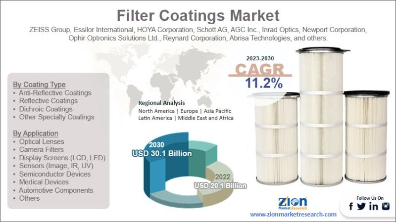 The global filter coatings market was valued at USD 20.1 billion in 2022 and is expected to reach USD 30.1 billion by 2030, expanding at a CAGR of around 11.2% between 2023 and 2030. Growth is driven by rising adoption of advanced optical technologies across electronics, automotive, healthcare, and telecommunications industries.