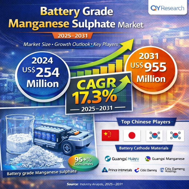 The global market for Battery Grade Manganese Sulphate was estimated to be worth US$ 254 million in 2024 and is forecast to reach a readjusted size of US$ 955 million by 2031, expanding at a robust CAGR of 17.3% during the forecast period 2025-2031.
