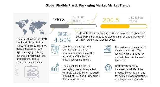 The report "Flexible Plastic Packaging Market by Type (Pouches, Rollstocks, Bags, Wraps), Material (Plastic & Aluminum Foil), Application (Food, Beverage, Pharma & Healthcare, Personal care & Cosmetics), Technology, and Region – Global Forecast To 2025", The global flexible plastic packaging market size is projected to grow from USD 160.8 billion in 2020 to USD 200.5 billion by 2025, at a CAGR of 4.5% from 2020 to 2025. The market is projected to grow in accordance with the increase in the demand for flexible plastic packaging for food, beverage, and cosmetics products across the globe. Furthermore, the flexible plastic packaging market has witnessed a significant increase in its demand for the supply of grocery, drugs, and vegetables & meat through online channels, during the ongoing COVID-19 pandemic.Download PDF Brochure @ https://www.marketsandmarkets.com/pdfdownloadNew.asp?id=1271