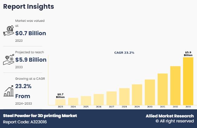 Allied Market Research published a report, titled, "Steel Powder for 3D printing Market by Material (Stainless Steel, Nickel, Titanium, and Maraging) and Application (Aerospace, Automotive, Medical, Tooling, and Others): Global Opportunity Analysis and Industry Forecast, 2024-2033". According to the report, the "steel powder for 3d printing market" was valued at $0.7 billion in 2023, and is estimated to reach $5.9 billion by 2033, growing at a CAGR of 23.2% from…