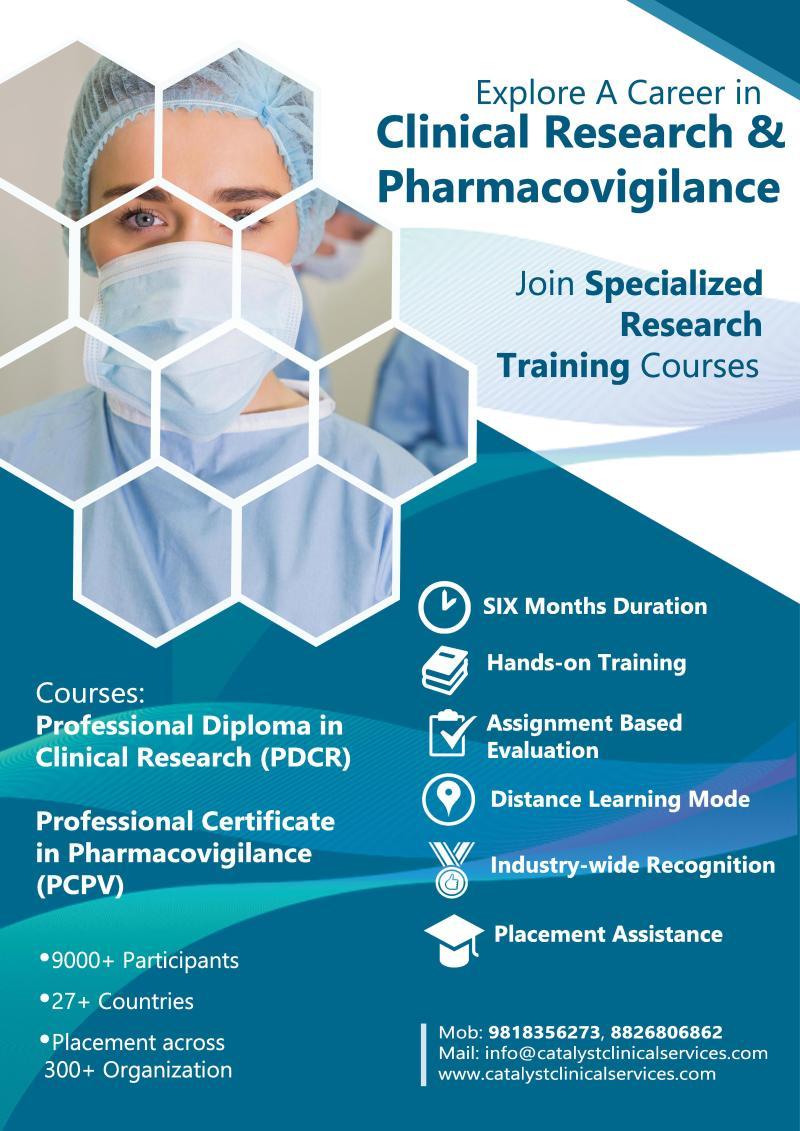 Despite of being such important topics, an unmet need of the required training and skills development exists at the level of graduates/postgraduates students from medical, pharmacy and Life-sciences disciplines. Catalyst Clinical Services Pvt. Ltd., a leading clinical research organization is pleased to announce the intake for the December batch of its specialized research training courses namely Professional Diploma in Clinical Research and Professional Certificate in Pharmacovigilance. Both the courses are skills development courses with an aim to equip the participants with the knowledge and competencies required for the clinical research and pharmacovigilance professional. Over the past 16 years more than 10000 participants across 27 countries have enrolled for the various research training courses offered by Catalyst. For further details get in touch with the Program Coordinator at info@catalystclinicalservices.com