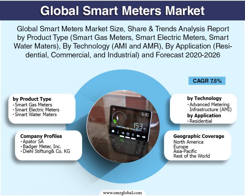 The global market for smart meters is projected to have considerable CAGR of around 7.5% during the forecast period. The market growth mainly backed by the increasing inclination towards smart meters in place of conventional meters due to various advantages, such as theft detection and leakage management further raises the demand for smart meters across the globe. The smart meters provides theft and accurate billing and enhanced customer services by the integration of AMI systems. Along with that, the growth is attributed to increasing penetration of smart meters in the near future, owing to government regulation and initiatives, rising demand for utility management, and rising urbanization in emerging economies such as India and China. Additionally, smart meters support in-house displays, keeping the consumers informed about the energy used by them in real-time. Some of the smart meters offer remote access to various utility's control center and consumers can pay bills through mobile app syncing. Therefore growing penetration of smartphone also projected to provide significant opportunity to the market.Get Free Sample Copy @ https://www.omrglobal.com/request-sample/smart-meters-market