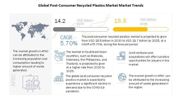 The report "Post-consumer Recycled Plastics Market by Polymer Type, Service, Processing Type (Mechanical, Chemical, Biological), End-use Application (Packaging, Building & Construction, Automotive, Furniture, Electronics), and Region – Global Forecast To 2025", The global post-consumer recycled plastics market size is projected to grow from USD 14.2 billion in 2020 to USD 18.8 billion by 2025, at a CAGR of 5.7% from 2020 to 2025. The increasing urban population, rapid industrialization, growing concern toward the environmental impact of the improper disposal of plastic waste, along with laws & regulations regarding the disposal and treatment of plastic waste, have propelled the growth of the global plastic waste management industry. The increase in the GDP of a country will enable it to work with more advanced and effective waste management solutions, which will, in turn, increase the demand for waste management services, equipment, and technologies.Browse 153 market data Tables and 42 Figures spread through 197 Pages and in-depth TOC on "Post-consumer Recycled Plastics Market – Global Forecast To 2025"