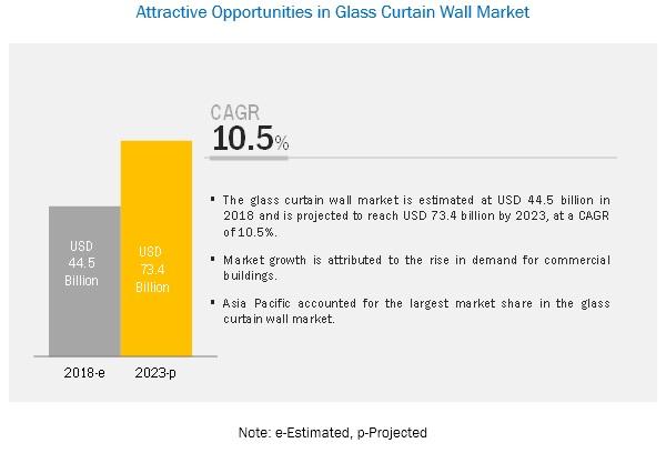 The report "Glass Curtain Wall Market by Type (Unitized curtain wall, stick curtain wall), End-use (Commercial, Public, Residential), and Region (North America, Europe, Asia Pacific, Middle East & Africa, South America) - Global Forecast to 2023" The glass curtain wall market is estimated at USD 44.5 billion in 2018 and is projected to reach USD 73.4 billion by 2023, at a CAGR of 10.50%. The rising infrastructure and building & construction industries drive the demand for glass curtain walls. Furthermore, the increase in demand from end-use industries of glass curtain wall further boosts market growth.Browse 148 market data Tables and 33 Figures spread through 151 Pages and in-depth TOC on "Glass Curtain Wall Market - Global Forecast to 2023"