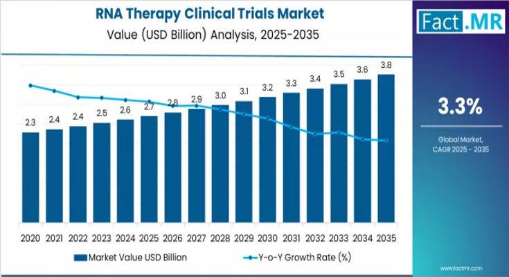 The global RNA therapy clinical trials market is projected to expand significantly over the next decade, driven by rising interest in genetic medicine, increasing investment in RNA-based platforms, and growing demand for personalized therapies. From an estimated USD 2.70 billion in 2025, the market is forecast to reach approximately USD 3.75 billion by 2035, reflecting a compound annual growth rate (CAGR) of about 3.3%.
