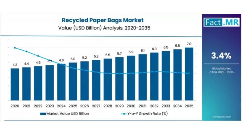 The global recycled paper bags market is set for steady growth as governments, brands, and consumers intensify efforts to reduce plastic waste and adopt environmentally responsible packaging solutions. According to industry analysis, the market is projected to expand from USD 5 billion in 2025 to USD 7 billion by 2035, advancing at a CAGR of 3.4% during the forecast period.