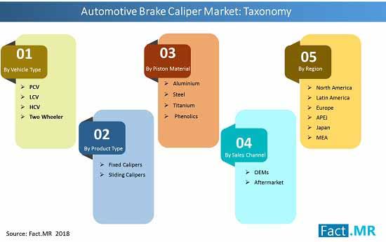 The global market for automotive brake caliper is segmented as per vehicle type, product type, by distribution channel, and by piston material. This report assesses trends that are driving the growth of each segment on the global level and offers potential takeaways that could prove substantially useful to automotive brake caliper manufacturers looking to enter the market. Main regions assessed in this report include North America, Latin America, Europe, Japan, Asia Pacific excluding Japan (APEJ), and the Middle East & Africa (MEA).