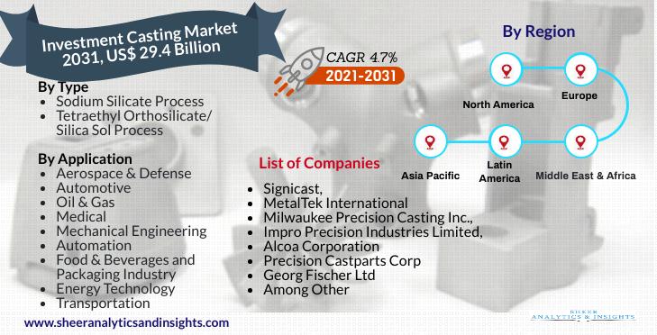 According to a new market research report published by sheer analytics and insights, “The Global Investment Casting Market was valued at $17.2 Billion in 2020, Growing at a high CAGR of more than 4.7% between 2021 and 2031, it is estimated to reach $29.4 Billion by 2031, as per the latest market research report titled Global Investment Casting Market - Industry analysis, size, share, growth, trends, and forecast, 2021-2031.Get Sample Copy With Covid19 Impact Analysis: https://www.sheeranalyticsandinsights.com/request-sample/investment-castings-market-21
