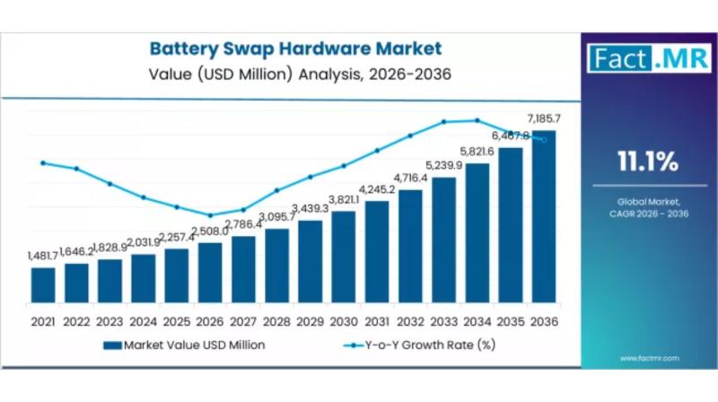 The global battery swap hardware market is set for robust growth, driven by the rapid adoption of electric vehicles (EVs) and the increasing demand for faster, more convenient, and cost-effective energy replenishment solutions. According to recent market analysis, the market is projected to expand from USD 2,508.0 million in 2026 to USD 7,185.7 million by 2036, registering a strong CAGR of 11.1% over the forecast period. This represents a total…