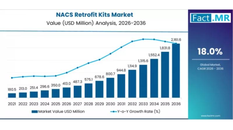 The global NACS retrofit kits market is set for rapid expansion, driven by the accelerating adoption of electric vehicles (EVs) and the industry-wide transition toward standardized charging infrastructure. According to Fact.MR, the market is projected to grow from USD 413.0 million in 2026 to USD 2,161.6 million by 2036, registering a robust CAGR of 18.0% during the forecast period. This represents a total market growth of 423.3% between 2026 and…