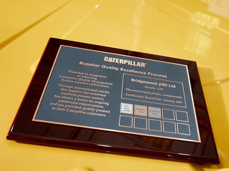 Bridgewood (UK) Ltd, East Yorkshire based Vacuum Formed Thermoplastics experts achieve the highest possible (Platinum) level supplier performance award from Global giant Caterpillar.The accreditation (CAT SQEP or Supplier Quality Excellence Program – awards from Bronze, through Silver, Gold & Platinum levels) which has only ever been achieved by a select group of Caterpillars global supply base, focuses on sustained Delivery and Quality performance metrics. Having been awarded Bronze and Silver over the past few years Bridgewood who manufacturer thermoplastic exterior body panels for CAT have now attained Platinum based on their 2020 supplier performance, the only Plastics supplier world-wide to do so.