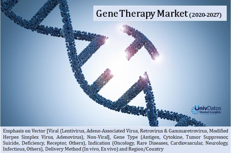 Research report presented by UnivDatos, Emphasis on Vector [Viral (Lentivirus, Adeno-Associated Virus, Retrovirus & Gammaretrovirus, Modified Herpes Simplex Virus, Adenovirus), Non-Viral], Gene Type (Antigen, Cytokine, Tumor Suppressor, Suicide, Deficiency, Receptor, Others), Indication (Oncology, Rare Diseases, Cardiovascular, Neurology, Infectious, Others), Delivery Method (In vivo, Ex vivo) and Geographical analysis (key regions and countries).As per the research report, Global Gene Therapy Market is expected to reach the market valuation of US$ 20.9 billion by 2027 expanding at a reasonable CAGR of 29.7% during the forecast period (2021-2027) from US$ 3.5 billion in 2019. Gene therapy inserts genetic material into cells to compensate for abnormal genes or to make a beneficial protein. The increasing number of clinical trials that are underway and tremendous mergers, acquisitions, and venture capital investments in the gene-therapy sector make the future looks bright for such therapies. To date, approximately 2,600 gene therapy clinical studies have been completed, are ongoing, or have been approved globally. More than ever, the field of gene therapy seeks to identify a route to the clinic and the market. Approximately 20 gene therapies have now been licensed and over two thousand clinical trials of human gene therapy have been published globally. Such advancements generate great hope that debilitating rare and inherited disorders as well as incurable diseases can be treated.