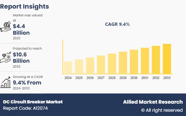 The global DC circuit breaker market was valued at $4.4 billion in 2023, and it is projected to reach $10.6 billion by 2033, growing at a strong CAGR of 9.4% from 2024 to 2033. This significant growth is driven by rising demand for renewable energy systems, increasing adoption of electric vehicles, and advancements in grid infrastructure.