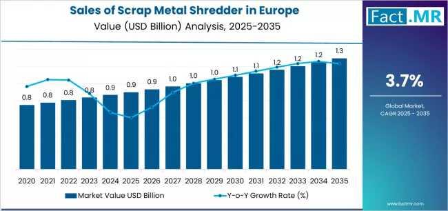 The European scraap metal shredder market is set for steady growth over the next decade, fueled by rising metal recycling operations, increased steel production, and growing adoption of advanced material reduction technologies. According to a new Fact.MR report, the market is expected to grow from USD 0.9 billion in 2025 to approximately USD 1.3 billion by 2035, representing a 42.9% absolute increase and a CAGR of 3.7%.