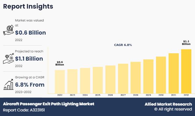 According to the report, the aircraft passenger exit path lighting market was valued at $585.2 million in 2022, and is estimated to reach $1,101.8 million by 2032, growing at a CAGR of 6.8% from 2023 to 2032.