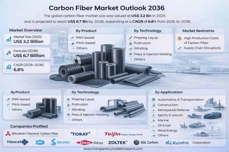 The global carbon fiber market is poised for substantial expansion over the next decade, driven by the increasing adoption of lightweight, high-strength materials across automotive, aerospace, wind energy, and electric vehicle applications. According to recent industry analysis, the market was valued at US$ 3.2 Bn in 2025 and is projected to reach US$ 6.7 Bn by 2036, expanding at a CAGR of 6.8% from 2026 to 2036.
