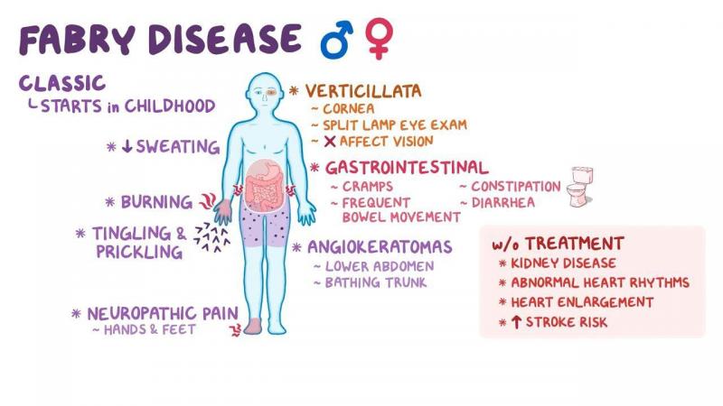 Fabry disease is a rare X-linked lysosomal storage disorder. This patient has a deficiency in the enzyme alpha galactosidase, which progresses to organ failure. The development of fabry illnesses is mostly caused by abnormal accumulation of a certain fatty substance known as globotriaosylceramide. This aberrant buildup can be detected in the skin, eyes, heart, kidney, brain, gastrointestinal system, and central nervous system, among other body parts.