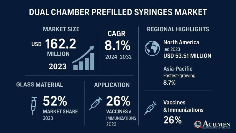According to the latest report by Acumen Research and Consulting, the global Dual Chamber Prefilled Syringes Market is witnessing rapid expansion, driven by rising adoption of advanced drug delivery systems, increasing demand for biologics, and the growing emphasis on patient safety and convenience.