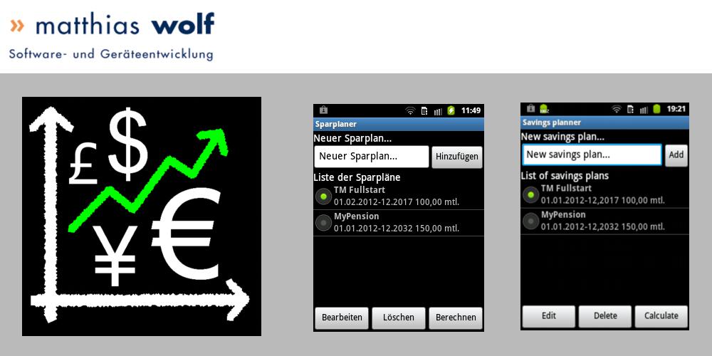 The app can be found in the Google Play Store. The search for "Savings planner" provides the site with the full version. The search for "Savings planner FREE" provides the site with the free test version that is restricted to no data file import, one savings plan, one premium definition and one single payment.