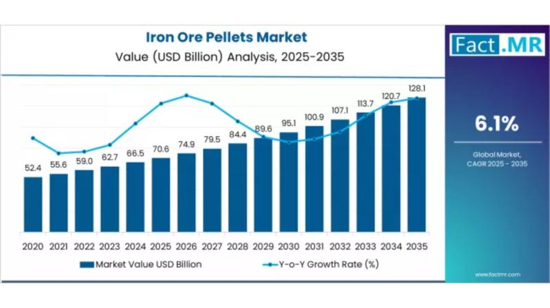 The global iron ore pellets market is positioned for strong and sustained growth, fueled by rising investments in modern steelmaking technologies and increasing emphasis on high-efficiency, low-emission metallurgical processes. According to a recent Fact.MR analysis, the market is projected to expand from USD 70.6 billion in 2025 to USD 128.1 billion by 2035, registering a healthy CAGR of 6.1% during the forecast period.