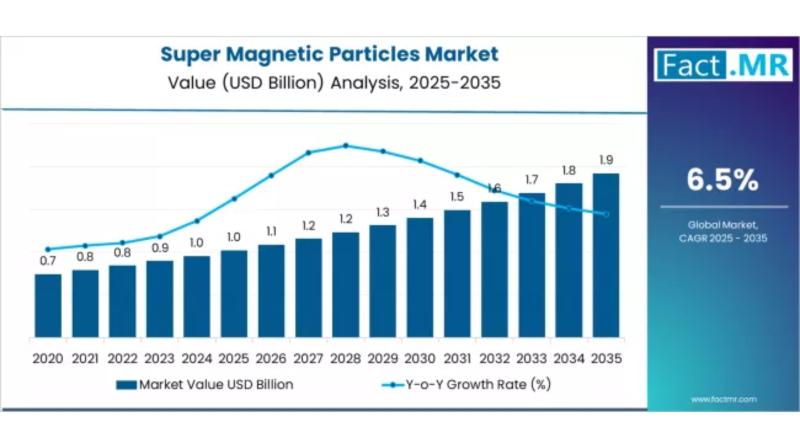 The global super magnetic particles market is set for strong and sustained growth, driven by accelerating adoption of magnetic nanotechnologies and rising investments across biomedical, data storage, and industrial applications. According to Fact.MR, the market is projected to grow from USD 1,020.0 million in 2025 to USD 1,920.0 million by 2035, registering a CAGR of 6.5% during the forecast period.