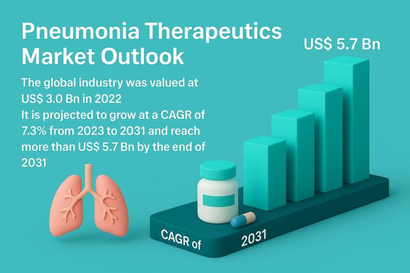 The global pneumonia therapeutics market was valued at US$ 3.0 billion in 2022 and is projected to expand at a compound annual growth rate (CAGR) of 7.3% from 2023 to 2031, reaching more than US$ 5.7 billion by the end of 2031. This steady growth trajectory reflects the rising global burden of pneumonia, continuous advancements in drug development, and increasing healthcare spending across both developed and emerging economies.