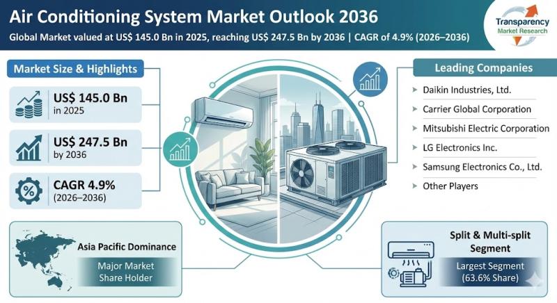The global air conditioning system market was valued at US$ 145.0 Bn in 2025 and is projected to reach US$ 247.5 Bn by 2036, expanding at a CAGR of 4.9% from 2026 to 2036. The market is poised for steady growth driven by rising global temperatures, rapid urbanization, increasing construction activities, expanding commercial infrastructure, and growing demand for energy-efficient cooling solutions.