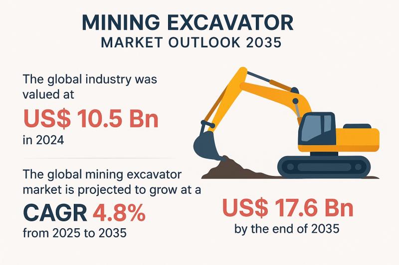 The global mining excavator market (https://www.transparencymarketresearch.com/mining-excavator-market.html) is poised for steady expansion as mining activities intensify across emerging economies and industry players embrace automation, sustainability, and digital innovation. Valued at US$ 10.5 billion in 2024, the market is projected to expand at a CAGR of 4.8% from 2025 to 2035, reaching US$ 17.6 billion by 2035, according to the latest industry projections.