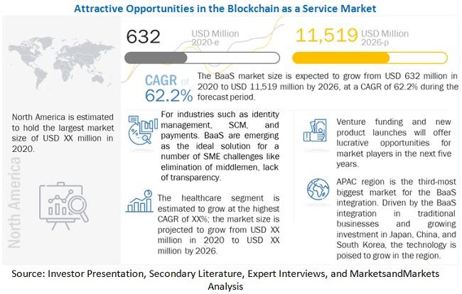 According to a new market research report "Blockchain as a Service (BaaS) Market by Offering (Tools and Services), Application (Supply Chain Management, Smart Contracts, Identity Management, GRC Management), Organization Size, End User (FMCG, Healthcare), and Region - Global Forecast to 2026" published by MarketsandMarkets™, the global post-COVID-19 BaaS market size to grow from USD 632 million in 2020 to USD 11,519 million by 2026, at a Compound Annual Growth Rate (CAGR) of 62.2% during the forecast period.Browse in-depth TOC on "Blockchain as a Service (BaaS) Market”