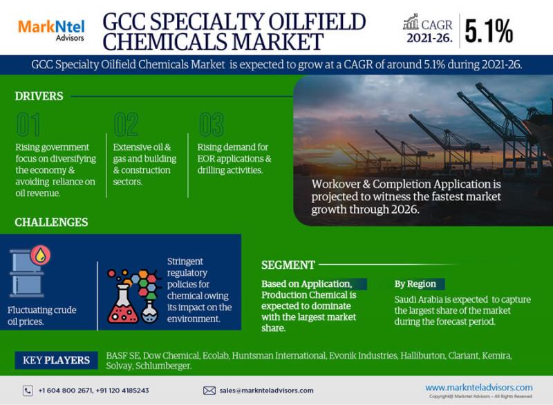 According to MarkNtel Advisors, the GCC Specialty Oilfield Chemicals Market is anticipated to grow at a CAGR of around 5.1% during 2021-26. The market growth principally attributes to the use of specialty chemicals to extend the durability of industrial equipment by removing unwanted deposited metal scales & minimizing the equipment maintenance costs.Get a sample copy free of the market research: https://www.marknteladvisors.com/query/request-sample/gcc-specialty-oilfield-chemicals-market.html