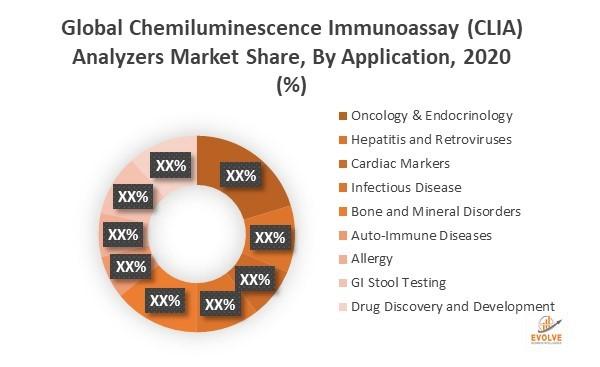 The global Chemiluminescence Immunoassay (CLIA) Analyzers Market is segmented based on Type, Product, and Application. Based on type, the market is segmented as high throughput, medium throughput, and low throughput. Based on product, the market is segmented as reagents, analyzers, and consumables. Based on application, the market is segmented as oncology & endocrinology, hepatitis, and retroviruses, cardiac markers, infectious disease, bone and mineral disorders, auto-immune diseases, allergy, GI stool testing, drug discovery, and development.