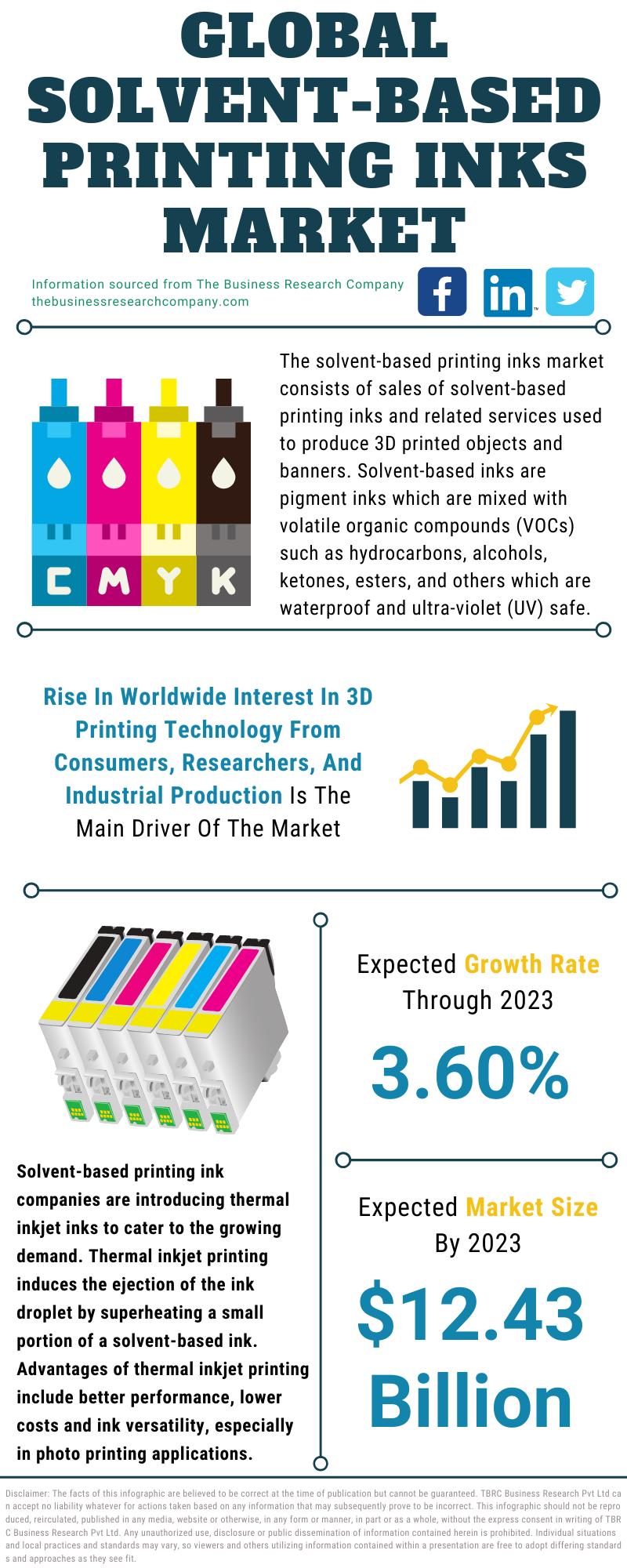 The solvent-based printing inks market consists of sales of solvent-based printing inks and related services used to produce 3D printed objects and banners. Solvent-based inks are pigment inks which are mixed with volatile organic compounds (VOCs) such as hydrocarbons, alcohols, esters, and others which are waterproof and ultra-violet (UV) safe. They are relatively inexpensive and enable printing on flexible, uncoated vinyl substrates, which are used to produce vehicle graphics, billboards, 3D printed objects, banners and adhesive decals.