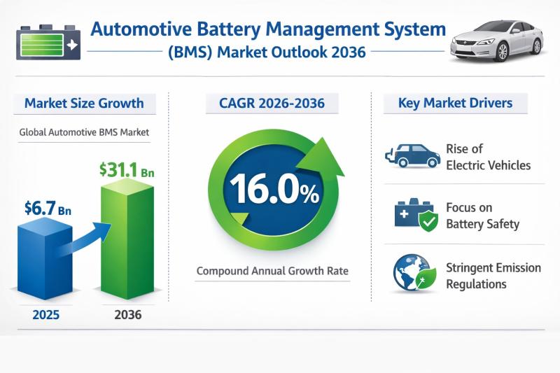 The global Automotive Battery Management System (BMS) market was valued at US$ 6.7 billion in 2025 and is projected to expand significantly to US$ 31.1 billion by 2036, registering a robust compound annual growth rate (CAGR) of 16.0% during the forecast period from 2026 to 2036. This strong growth trajectory highlights the rising strategic importance of BMS solutions as electric and hybrid vehicles become central to the global automotive ecosystem.