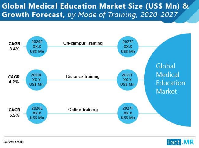 Fact.MR has studied the medical education market with detailed segmentation on the basis of delivery method, mode of training, types of training, type of organization and region.