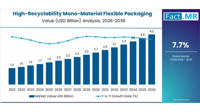 The global high-recyclability mono-material flexible packaging market is set for strong expansion as brands and regulators intensify efforts to reduce plastic waste and improve recyclability. According to industry analysis by Fact.MR, the market is valued at USD 2.00 billion in 2026 and is projected to reach USD 4.20 billion by 2036, registering a steady CAGR of 7.7% between 2026 and 2036.
