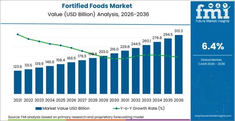 The global food ecosystem is entering a decisive phase where public health mandates and consumer-led premiumisation are reshaping formulation priorities. The fortified foods market, valued at USD 168.5 billion in 2026, is projected to reach USD 313.4 billion by 2036, expanding at a CAGR of 6.4%.