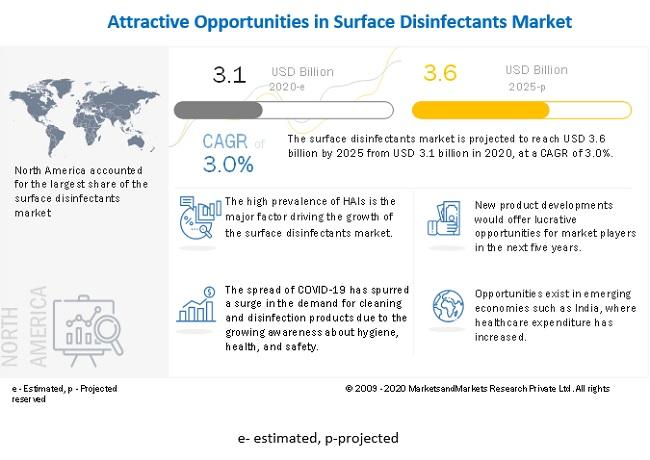 According to the new market research report "Surface Disinfectants Market by Composition (Quaternary Ammonium, Alcohols, Chlorine, Hydrogen Peroxide), Type (Liquids, Sprays, Wipes), Application (Surface, Instrument), End User (Hospitals, Diagnostic and Research Labs) - Global Forecast to 2025", published by MarketsandMarkets™, the global market is projected to reach USD 3.6 billion by 2025 from USD 3.1 billion in 2020, at a CAGR of 3.0% from 2020 to 2025.Browse in-depth TOC on "Surface Disinfectant Market"