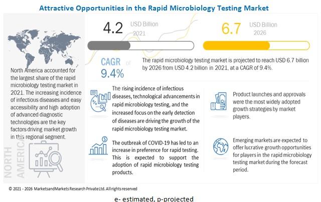 The Rapid Microbiology Testing Market growth is driven by the increased focus on the early detection of infectious disease, technological advancements, increased funding for R&D and increasing incidence of infectious disease.According to the new market research report "Rapid Microbiology Testing Market by Product (Reagents, Kits, Automated Identification System, PCR, Mass Spectrometry), Method (Growth, Nucleic Acid, Viability), Applications (Clinical Diagnosis, Pharma, Environmental) - Global Forecast to 2026", published by MarketsandMarkets™, is projected to reach USD 6.7 billion by 2026 from USD 4.2 billion in 2021, at a CAGR of 9.4%.